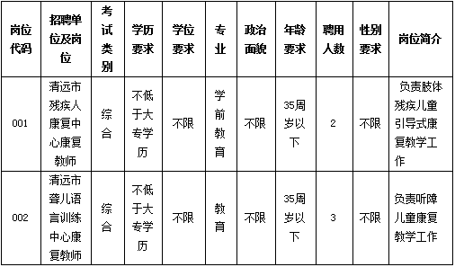 清遠(yuǎn)市殘疾人康復(fù)中心、清遠(yuǎn)市聾兒語(yǔ)言訓(xùn)練中心,是市殘聯(lián)直屬公益一類(lèi)事業(yè)單位,是專(zhuān)門(mén)為0-6歲殘障兒童康復(fù)的機(jī)構(gòu)。根據(jù)工作需要招聘康復(fù)教師5名(屬非編制人員,不列入用人單位編制序列,不擔(dān)任行政職務(wù)),現(xiàn)將有關(guān)事項(xiàng)公告如下: