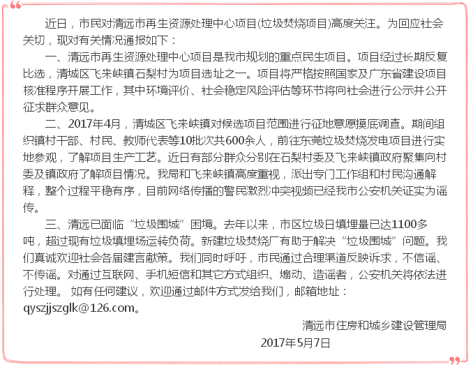 關(guān)于清城區(qū)飛來峽鎮(zhèn)石梨村清遠市再生資源處理中心項目的情況通報