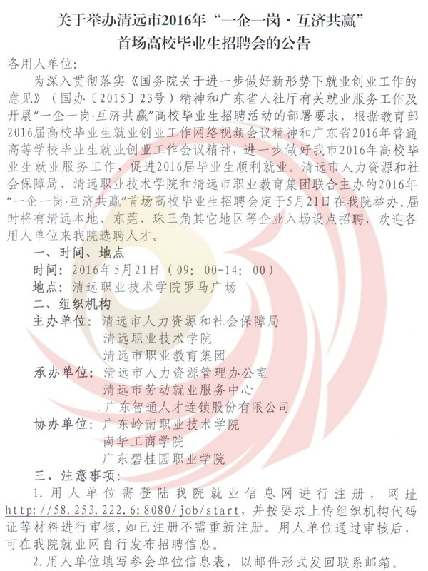 為深入貫徹落實(shí)《國(guó)務(wù)院關(guān)于進(jìn)一步做好新形勢(shì)下就業(yè)創(chuàng)業(yè)工作的意見》(國(guó)辦﹝2015﹞23號(hào))精神和廣東省人社廳有關(guān)就業(yè)服務(wù)工作及開展“一企一崗▪互濟(jì)共贏”高校畢業(yè)生找屁活動(dòng)的部署要求,根據(jù)教育部2016屆高校畢業(yè)生就業(yè)創(chuàng)業(yè)工作網(wǎng)絡(luò)視頻會(huì)議精神和廣東省2016年普通高等學(xué)校畢業(yè)生就業(yè)創(chuàng)業(yè)工作會(huì)議精神,進(jìn)一步做好我市2016年高校畢業(yè)生就業(yè)服務(wù)工作,促進(jìn)2016屆畢業(yè)生順利就業(yè)。清遠(yuǎn)市人力資源四川和社會(huì)保障局,清遠(yuǎn)市職業(yè)技術(shù)學(xué)院和清遠(yuǎn)市職業(yè)教育集團(tuán)聯(lián)合主辦的2016年“一企一崗▪互濟(jì)共贏”首場(chǎng)高校畢業(yè)生招聘會(huì)定于5月21日在清遠(yuǎn)市職業(yè)技術(shù)學(xué)院舉辦,屆時(shí)將有清遠(yuǎn)本地、東莞、珠三角其他地區(qū)等企業(yè)入場(chǎng)設(shè)點(diǎn)招聘,歡迎各用人單位到清遠(yuǎn)市職業(yè)技術(shù)學(xué)院選聘人才。